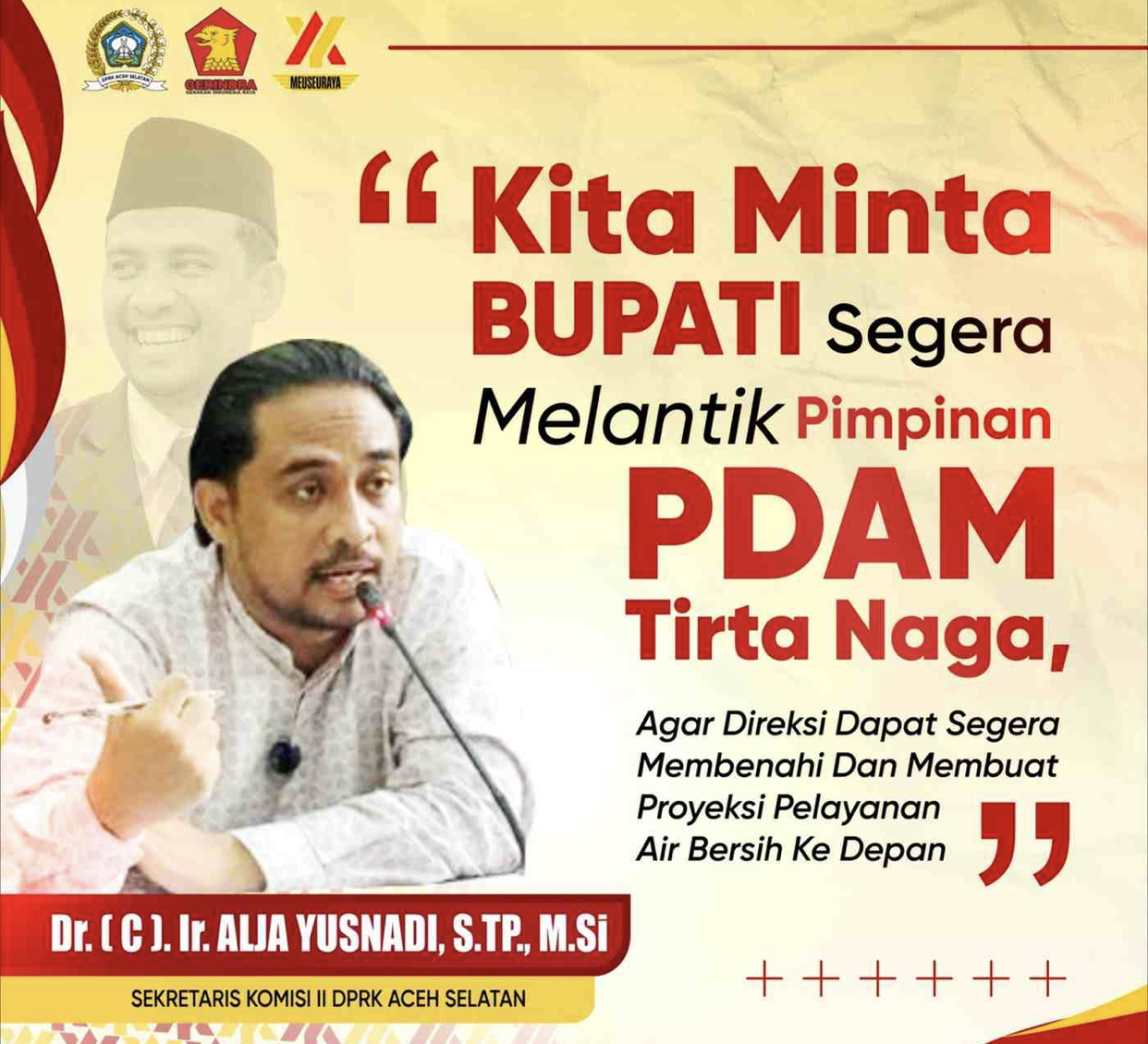 ASPIRATIF.ID — Sekretaris Komisi II DPRK Aceh Selatan Alja Yusnadi meminta Bupati Aceh Selatan H.Mirwan agar segera melantik Direktur Perusahaan Daerah Air Minum (PDAM) Tirta Naga.